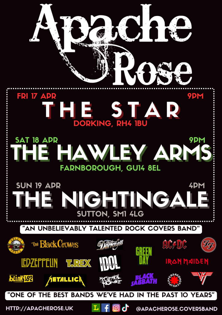 Apache Rose is a four-piece rock covers band. Established in 2018, we’ve played across the South East of England, and we’re always keen to play new venues and rock new crowds.